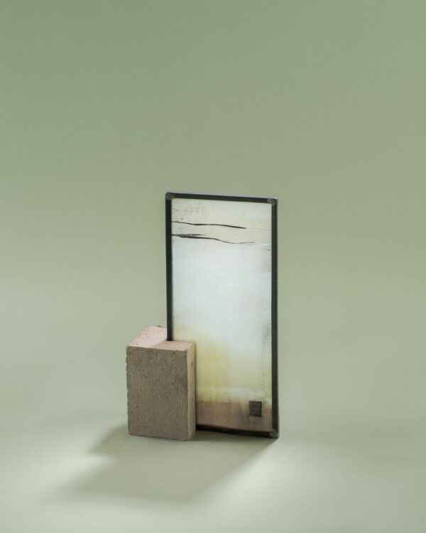 Sculpture vitrail au plomb, grisaille et émail, socle ciment.