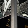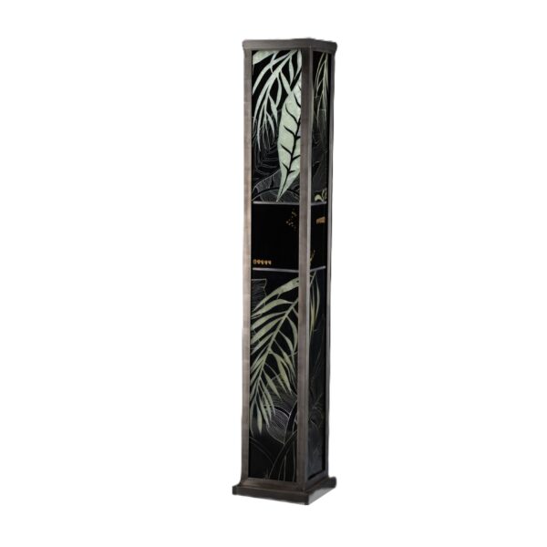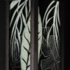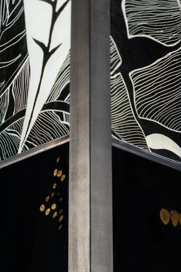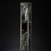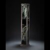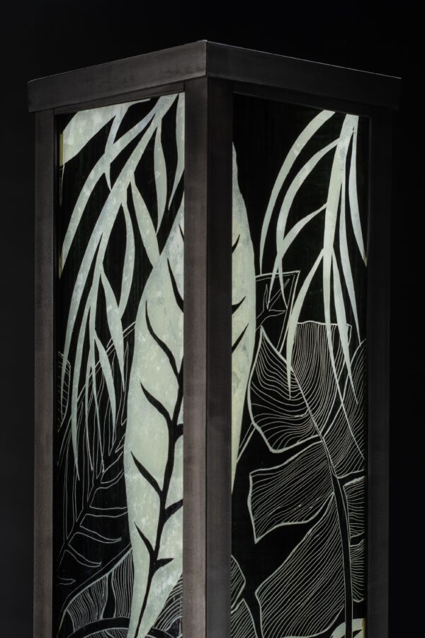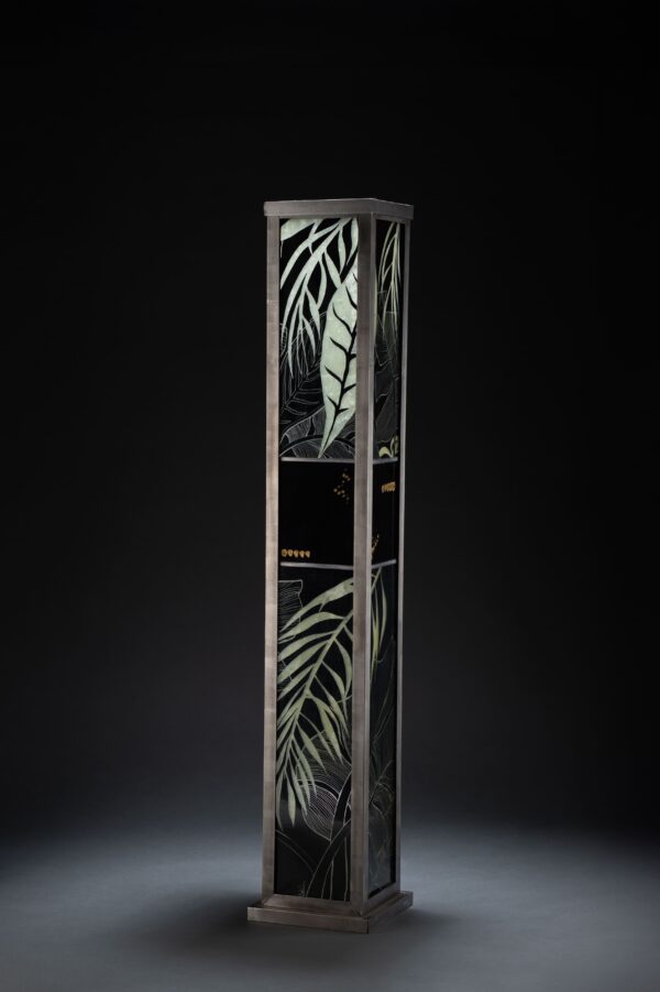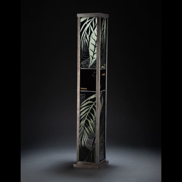 Lampe vitrail au plomb, grisaille et or, structure acier.