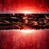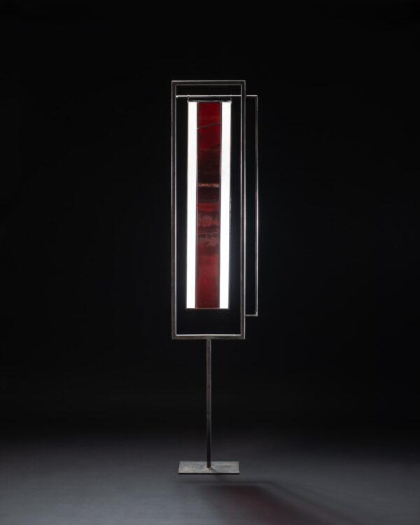 Sculpture sur châssis en acier brossé et vitrail au plomb et rouge de cuivre.